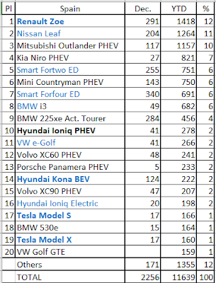 Despite the lack of incentives, the Spanish plug-in market is growing fast, with December hitting a record 2.256 units, jumping 126% YoY to 2.256 units (and a record 2.3% share), with the 2018 tally ending at over 11.000 units, a 56% increase over the 2017 result, allowing the 2018 PEV Share to end at a record 0.9%.