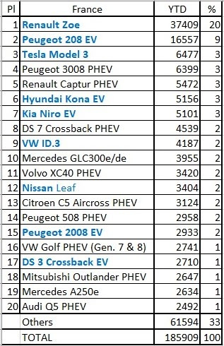 Looking at the manufacturers ranking, the new leader Peugeot dropped 2% in share, to 22%, but it is enough to stay ahead of the runner-up Renault (16%), while Kia (6%, down 1%) keeps its 3rd spot, ahead of Citroen, Volvo and Tesla, all with 4% each.